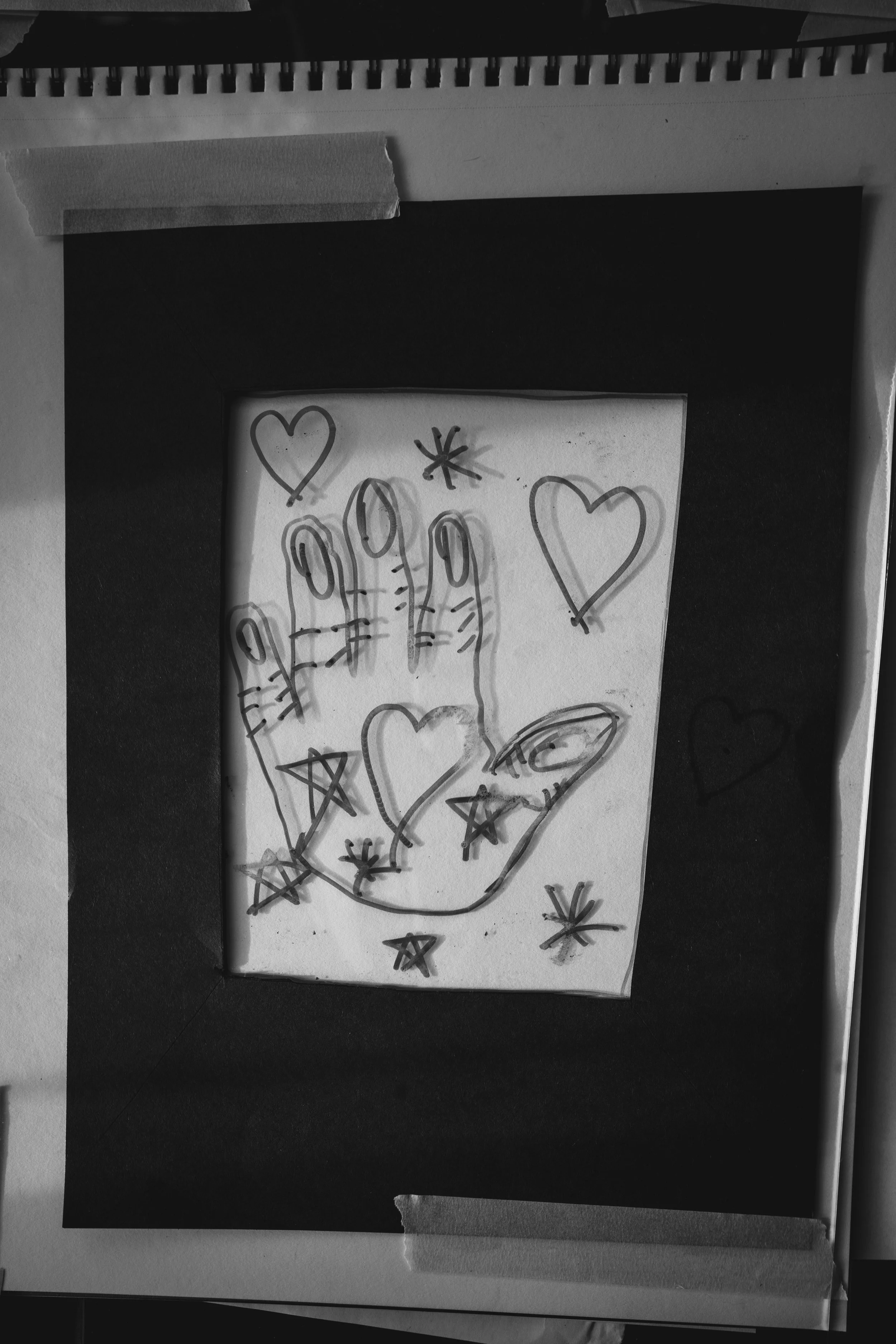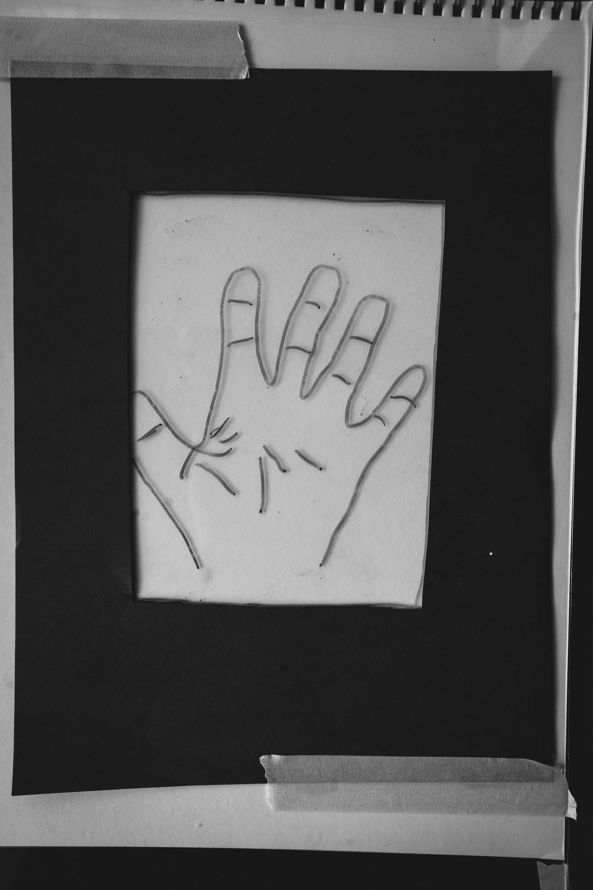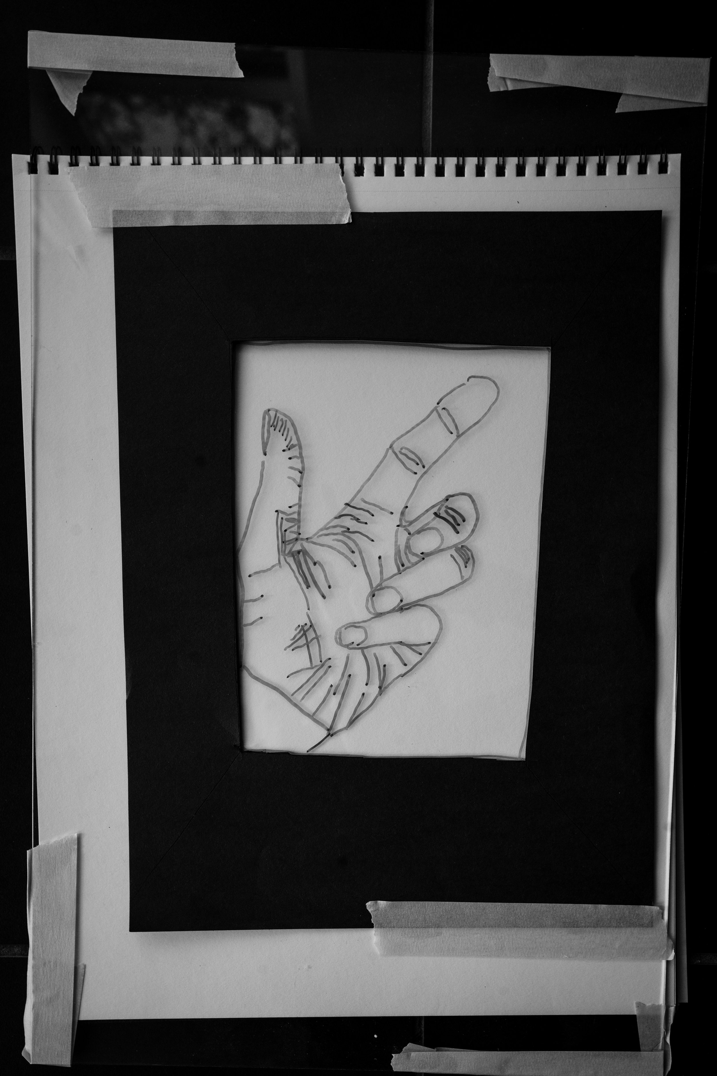 this morning betty asked us to get out our viewfinders and once again, draw our hands. this time, we drew with washable markers onto a glass surface while closing one eye. when i finished and placed my piece of glass overtop of my white paper, i was amazed (miles thought i drew too many little lines). i was also able to slide right into the ‘not caring about the outcome, i’m only drawing lines’ mode which was a great state to be in.